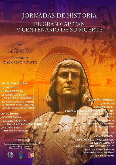 En la jornada del jueves intervendrán el catedrático José Enrique Ruiz-Domenec y el Doctor en Historia Moderna, José Calvo Poyato, que abordarán la figura del Gran Capitán desde diferentes ángulos, mientras que en la tarde el viernes Gloria Lora abordará cómo se vivía en la campiña en la época del Gran Capitán, mientras que José Luis Corral profundizará en los primeros años como militar del Gran Capitán durante la Guerra de Granada.