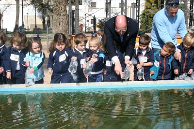 En total han participado más de doscientos niños de entre 3 y 5 años, de los cuatro colegio más cercanos a esta zona verde, que han soltado hasta 150 peces a los que previamente habían puesto nombre