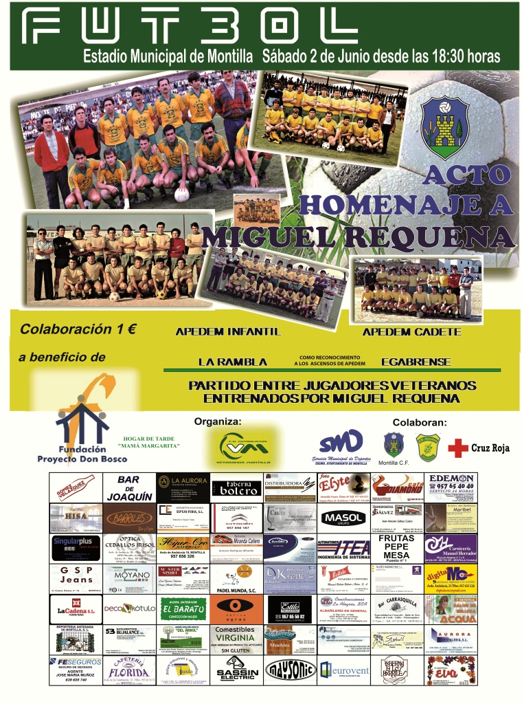 durante su carrera como entrenador, y en la que participarán diferentes personalidades que han compartido diferentes momentos con el entrenador montillano. Y tendrá su gran final el sábado 2 de junio, desde las 18:30 h, en el Estadio Municipal de Montilla, donde se celebrarán partidos de fútbol de las categorÃas infantil y cadete para finalizar con un encuentro de veteranos que disputarán futbolistas de toda la provincia que han estado a las órdenes de Miguel Requena.
