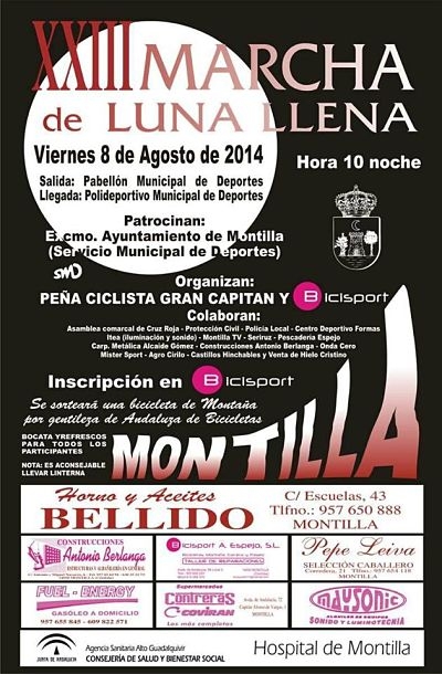 Salida en el Pabellón Municipal de deportes alas 22:00 de la noche, continuando por la Avenida de Andalucía, calle corredera, calle santa brigida, camino de la fuente nueva, fuente el piojo, Descansabacas lugar donde se dará a cada participante su botellín de agua, camino huerta de los limones, Pavo Sol, pasaremos por detrás de los Montis, llegando al antiguo hospital de montilla y al Polideportivo Municipal de Deportes META .